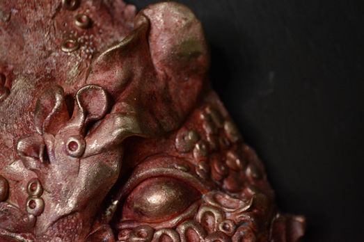 Sculpey clay, acrylic washes and gold enamel